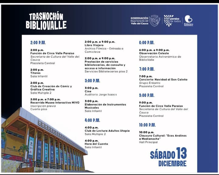 Cali se prepara para vivir una jornada cultural extendida este sábado 13 de diciembre. La Biblioteca Departamental Jorge Garcés Borrero transforma el concepto de trasnochón. Este no será uno de compras, sino una celebración de cultura, ciencia y convivencia familiar.